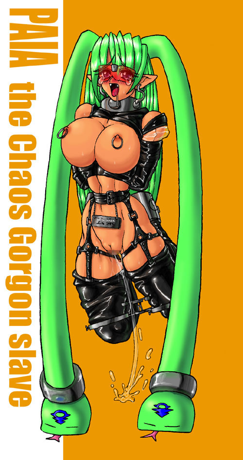 キスティオはピタリと回転を止めた。渡り廊下を奇妙な動きで歩いてくるのは、ゴルゴンの奴隷パイアである。パイアは鮮やかな緑色の蛇髪を脚代わりに、全身拘束具姿で中庭に飛び込んできた。