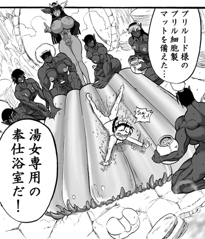 ブラックオーク娘・ボルガナの爆乳筋肉ボディを、おずおずと洗うユーニア…