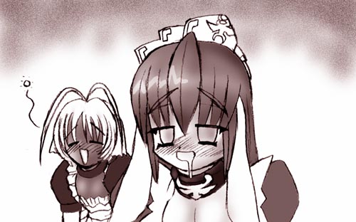 廊下をのたのたと歩いていた二人のけものメイドは、濁った目でラディアンスを見上げると、5秒ほどして、「あ」と声を出した。
