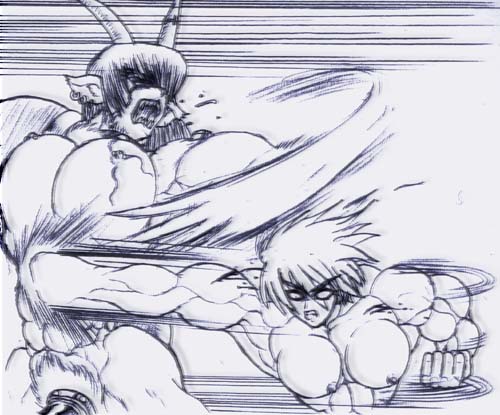神殿の天井に高い肉の音が響き、赤絨毯は二人の下でよじれ折り重なる。ヴィランデルの力強い一突きごとに、ジェナの逞しい肉体は壊れたバネのように跳ねた。二人の間から泡となってこぼれ落ちる大量の愛液、それに混じって戦士達にまで降りかかるジェナの射精。それは性というものに充溢した生命力を爆発させるような、凄まじい交わりだった。